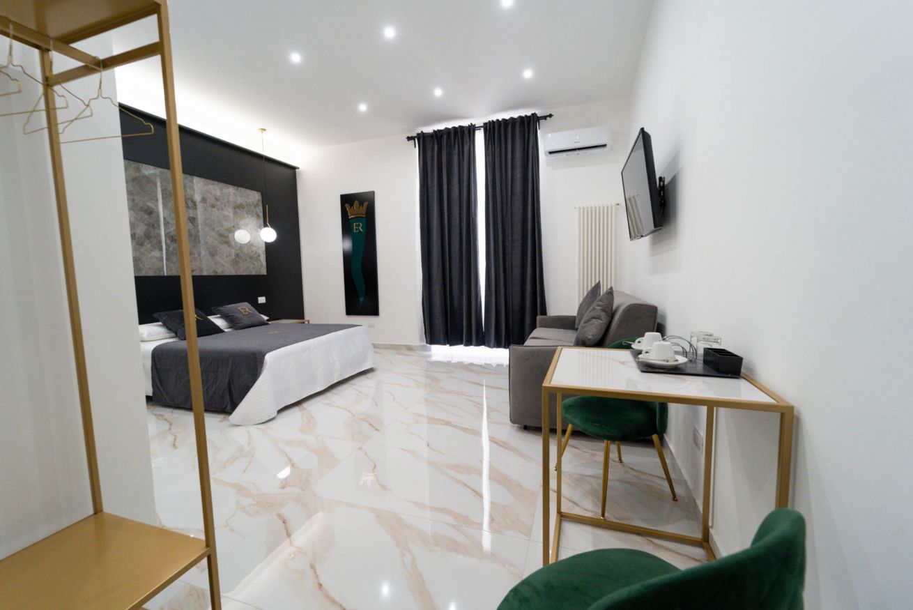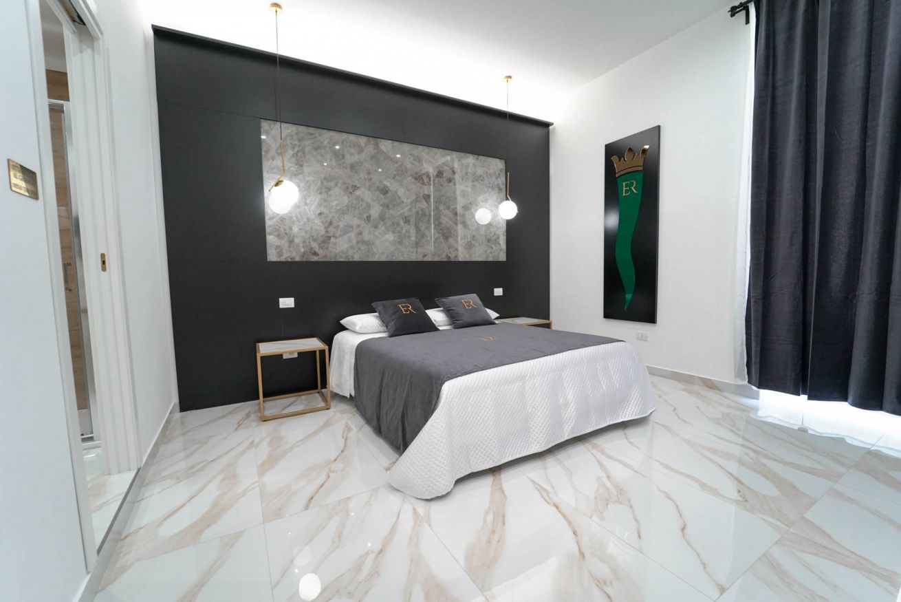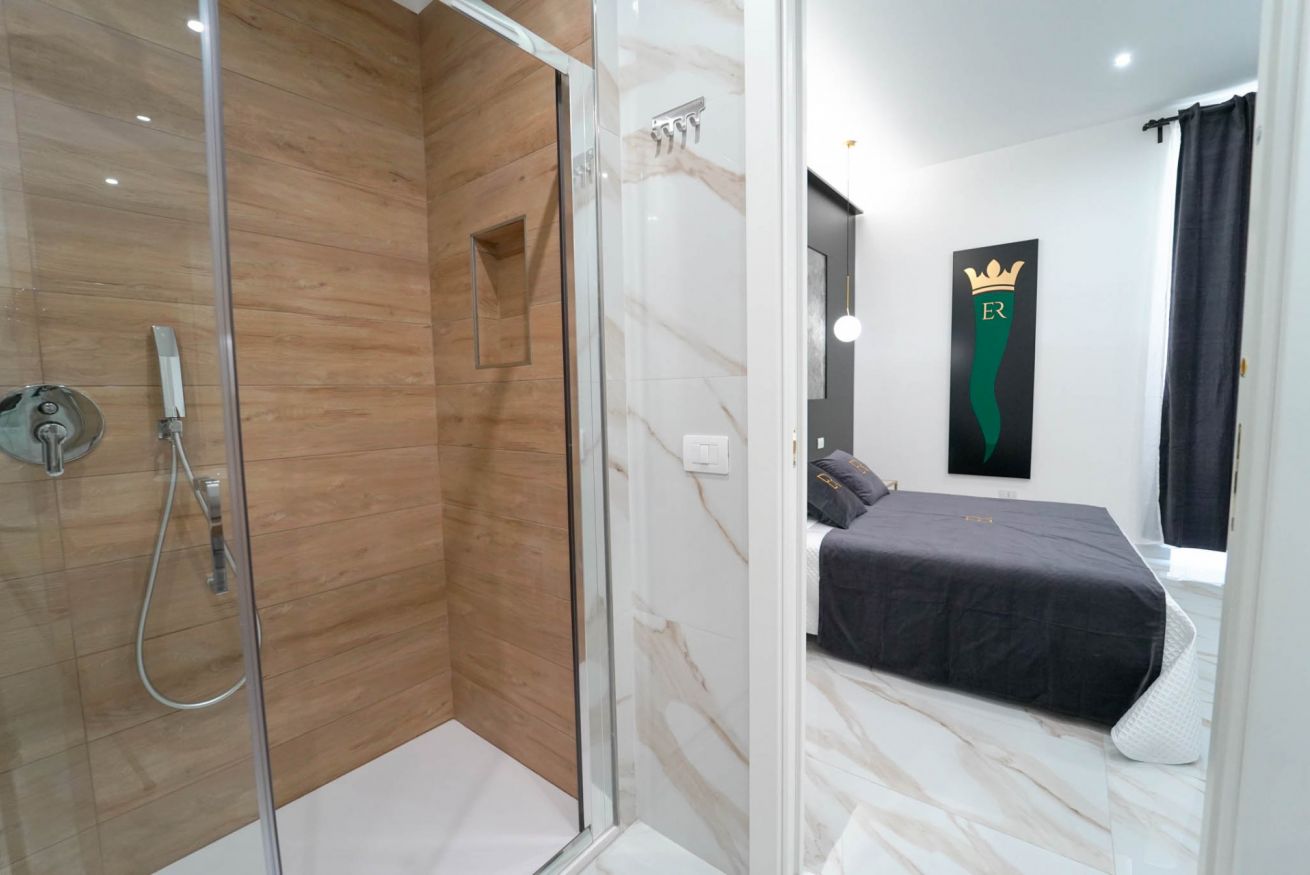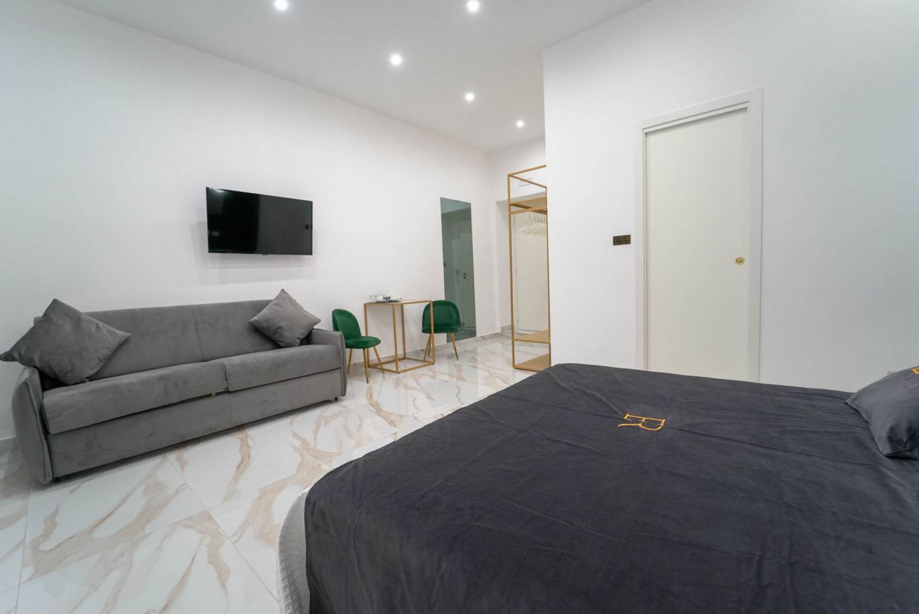 La più ampia e confortevole: camera quadrupla con letto matrimoniale e divano letto matrimoniale. Balcone con affaccio sulla strada e bagno privato con una doccia extra-large (ospita fino a 3 persone).