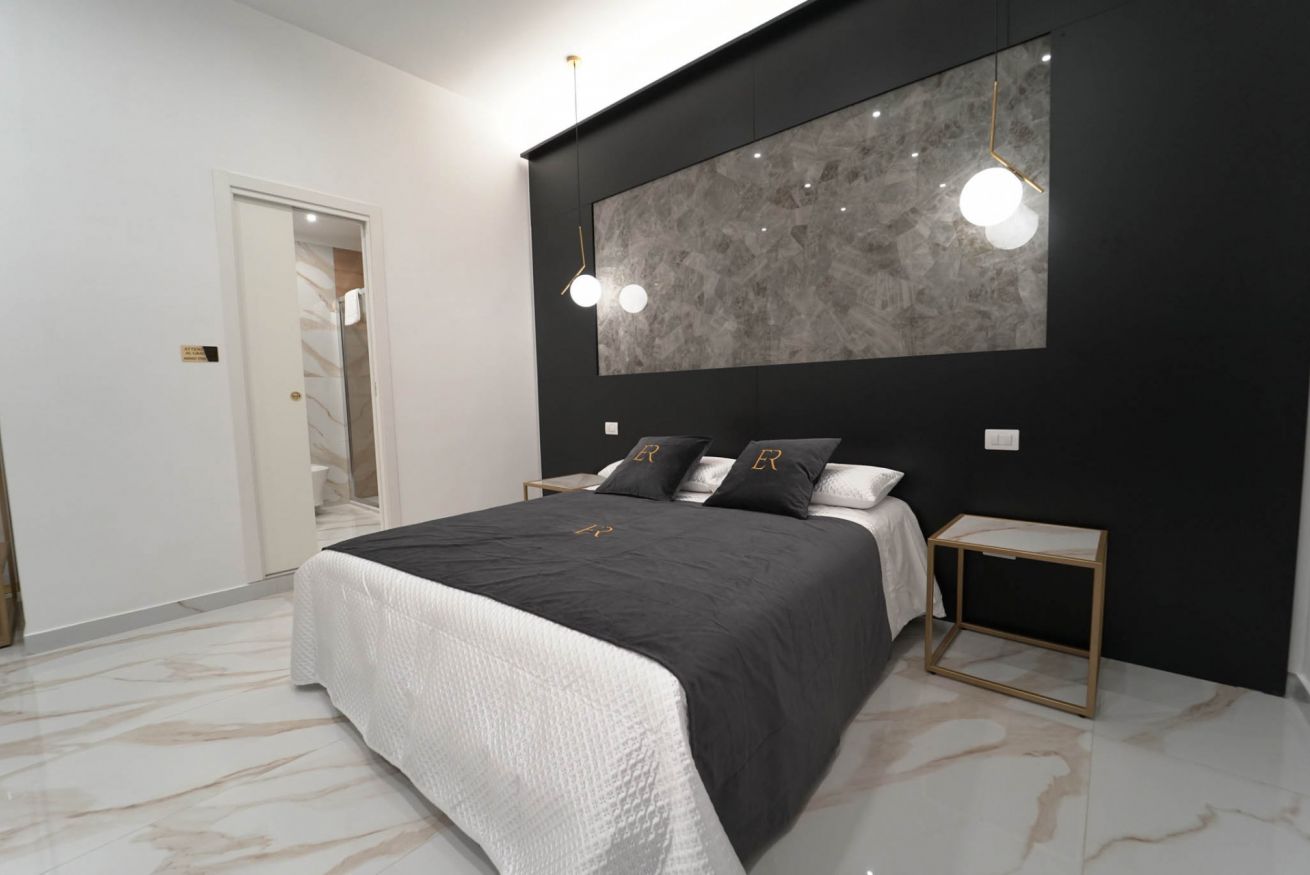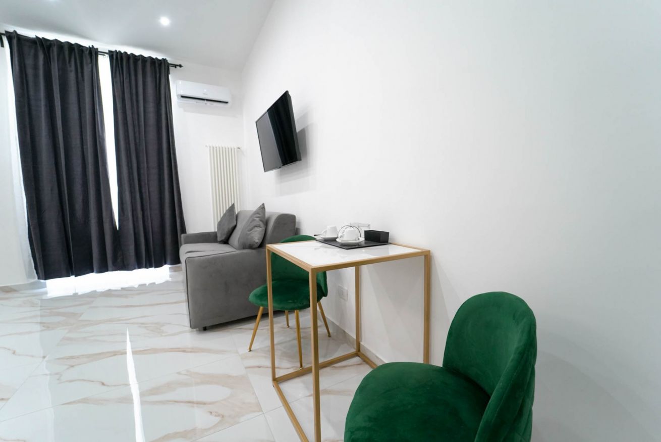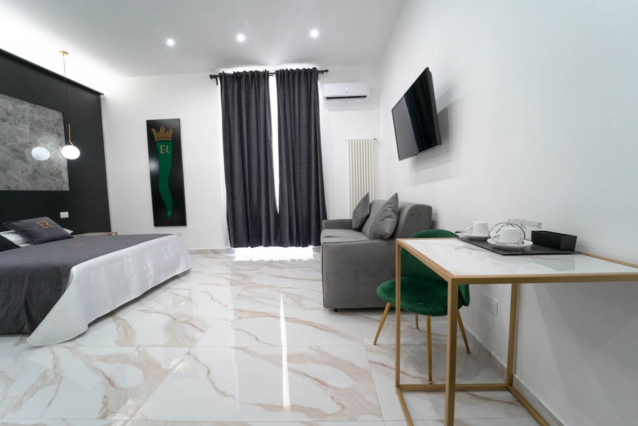 La più ampia e confortevole: camera quadrupla con letto matrimoniale e divano letto matrimoniale. Balcone con affaccio sulla strada e bagno privato con una doccia extra-large (ospita fino a 3 persone).