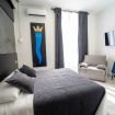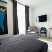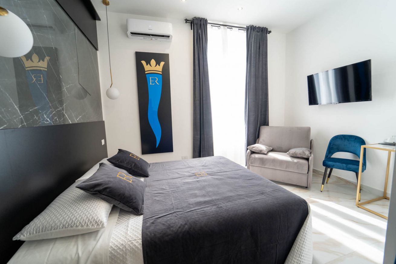 Camera tripla con letto matrimoniale e poltrona letto singola. Finestra con affaccio interno e bagno privato con doccia ampia.